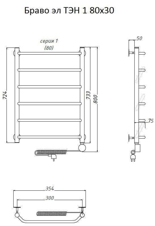 Внимание! Для скрытого монтажа электропроводки необходимо приобрести комплект скрытого подключения. Полотенцесушитель электрический комплектуется ТЭНом с терморегулятором и таймером. Изделие производится из нержавеющей стали AISI 201. Вертикальные трубы d -32 мм., для горизонтальных вставок используется труба d — 18 мм. Нагревательным элементом в полотенцесушителе является ТЭН. Полотенцесушитель заполнен бытовым антифризом.Экономичность: ТЭН нагревает антифриз до нужной температуры и выключается, далее при остывании полотенцесушителя он включается опять. Таким образом он работает не постоянно, и получается, что ТЭН потребляет электричество не 300 Вт, а порядка 100 — 150 Вт.Мощность электрического прибора порядка 100 Вт при стоимости 1 Вт — 5 руб несложно посчитать: 100Вт х 24 = 2,4 кВт в сутки. Стоимость эксплуатации изделия за сутки 2,4 кВт х 5 руб. = 12 руб. При максимальной температуре расход электричества за 30 дней составит порядка 360 руб. При условии если сушка работает круглосуточно на максимальной температуре.Удобство монтажа: Полотенцесушитель крепится к стене на четыре держателя. Изначально ТЭН не установлен в полотенцесушитель для безопасной транспортировки, его можно установить, как справа, так и слева предварительно перевернув полотенцесушитель вверх ногами и выкрутив заглушку с нужной стороны на место в которое установится ТЭН.Примечание. Внимательно изучите инструкцию по установке ТЭНа!Скрытое подключение: Для скрытого монтажа электропроводки необходимо приобрести комплект скрытого подключения.Подключение в розетку: В комплекте с ТЭНом имеется шнур с вилкой, который будет необходим при подключении к розетке.
