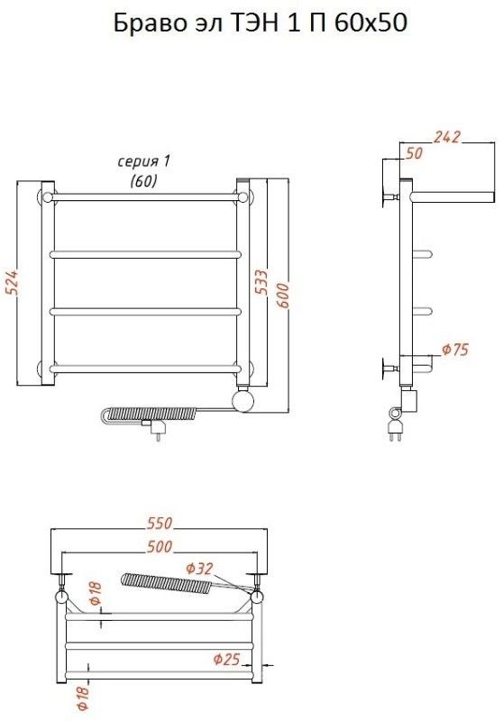 Внимание! Для скрытого монтажа электропроводки необходимо приобрести комплект скрытого подключения.Полотенцесушитель электрический комплектуется ТЭНом с терморегулятором и таймером.Изделие производится из нержавеющей стали AISI 201. Вертикальные трубы d -32 мм., для горизонтальных вставок используется труба d — 18 мм.Нагревательным элементом в полотенцесушителе является ТЭН. Полотенцесушитель заполнен бытовым антифризомЭкономичность: ТЭН нагревает антифриз до нужной температуры и выключается, далее при остывании полотенцесушителя он включается опять. Таким образом он работает не постоянно и получается, что ТЭН потребляет электричество не 300 Вт, а порядка 100 — 150 ВтМощность электрического прибора порядка 100 Вт при стоимости 1 Вт — 5 руб несложно посчитать: 100Вт х 24 = 2,4 кВт в сутки. Стоимость эксплуатации изделия за сутки 2,4 кВт х 5 руб. = 12 руб. При максимальной температуре расход электричества за 30 дней составит порядка 360 руб. При условии если сушка работает круглосуточно на максимальной температуре.Удобство монтажа: Полотенцесушитель крепится к стене на четыре держателя. Изначально ТЭН не установлен в полотенцесушитель для безопасной транспортировки, его можно установить, как справа, так и слева предварительно перевернув полотенцесушитель вверх ногами и выкрутив заглушку с нужной стороны на место в которое установится ТЭН.Примечание. Внимательно изучите инструкцию по установке ТЭНа!Скрытое подключение: Для скрытого монтажа электропроводки необходимо приобрести комплект скрытого подключения.Подключение в розетку: В комплекте с ТЭНом имеется шнур с вилкой, который будет необходим при подключении к розетке.