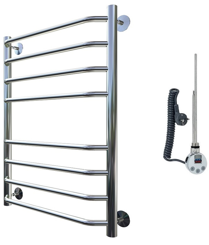Внимание! Для скрытого монтажа электропроводки необходимо приобрести комплект скрытого подключения.Полотенцесушитель электрический комплектуется ТЭНом с терморегулятором и таймером.Изделие производится из нержавеющей стали AISI 201. Вертикальные трубы d -32 мм., для горизонтальных вставок используется труба d — 18 мм.Нагревательным элементом в полотенцесушителе является ТЭН. Полотенцесушитель заполнен бытовым антифризомЭкономичность: ТЭН нагревает антифриз до нужной температуры и выключается, далее при остывании полотенцесушителя он включается опять. Таким образом он работает не постоянно и получается, что ТЭН потребляет электричество не 300 Вт, а порядка 100 — 150 ВтМощность электрического прибора порядка 100 Вт при стоимости 1 Вт — 5 руб несложно посчитать: 100Вт х 24 = 2,4 кВт в сутки. Стоимость эксплуатации изделия за сутки 2,4 кВт х 5 руб. = 12 руб. При максимальной температуре расход электричества за 30 дней составит порядка 360 руб. При условии если сушка работает круглосуточно на максимальной температуре.Удобство монтажа: Полотенцесушитель крепится к стене на четыре держателя. Изначально ТЭН не установлен в полотенцесушитель для безопасной транспортировки, его можно установить, как справа, так и слева предварительно перевернув полотенцесушитель вверх ногами и выкрутив заглушку с нужной стороны на место в которое установится ТЭН.Примечание. Внимательно изучите инструкцию по установке ТЭНа!Скрытое подключение: Для скрытого монтажа электропроводки необходимо приобрести комплект скрытого подключения.Подключение в розетку: В комплекте с ТЭНом имеется шнур с вилкой, который будет необходим при подключении к розетке.
