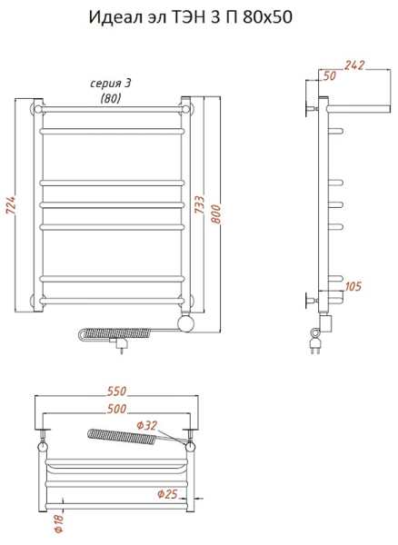 Внимание! Для скрытого монтажа электропроводки необходимо приобрести комплект скрытого подключения.Полотенцесушитель электрический комплектуется ТЭНом с терморегулятором и таймером.Изделие производится из нержавеющей стали AISI 201. Вертикальные трубы d -32 мм., для горизонтальных вставок используется труба d — 18 мм.Нагревательным элементом в полотенцесушителе является ТЭН. Полотенцесушитель заполнен бытовым антифризомЭкономичность: ТЭН нагревает антифриз до нужной температуры и выключается, далее при остывании полотенцесушителя он включается опять. Таким образом он работает не постоянно и получается, что ТЭН потребляет электричество не 300 Вт, а порядка 100 — 150 ВтМощность электрического прибора порядка 100 Вт при стоимости 1 Вт — 5 руб несложно посчитать: 100Вт х 24 = 2,4 кВт в сутки. Стоимость эксплуатации изделия за сутки 2,4 кВт х 5 руб. = 12 руб. При максимальной температуре расход электричества за 30 дней составит порядка 360 руб. При условии если сушка работает круглосуточно на максимальной температуре.Удобство монтажа: Полотенцесушитель крепится к стене на четыре держателя. Изначально ТЭН не установлен в полотенцесушитель для безопасной транспортировки, его можно установить, как справа, так и слева предварительно перевернув полотенцесушитель вверх ногами и выкрутив заглушку с нужной стороны на место в которое установится ТЭН.Примечание. Внимательно изучите инструкцию по установке ТЭНа!Скрытое подключение: Для скрытого монтажа электропроводки необходимо приобрести комплект скрытого подключения.Подключение в розетку: В комплекте с ТЭНом имеется шнур с вилкой, который будет необходим при подключении к розетке.