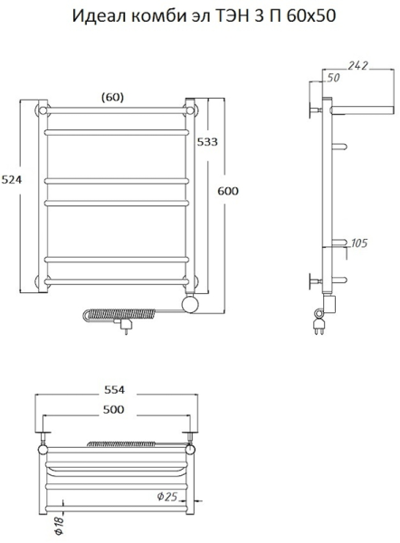Электрический полотенцесушитель Тругор Идеал комби 3 П с полкой 60x50см хром Идеал/комби3/элТЭН6050П купить