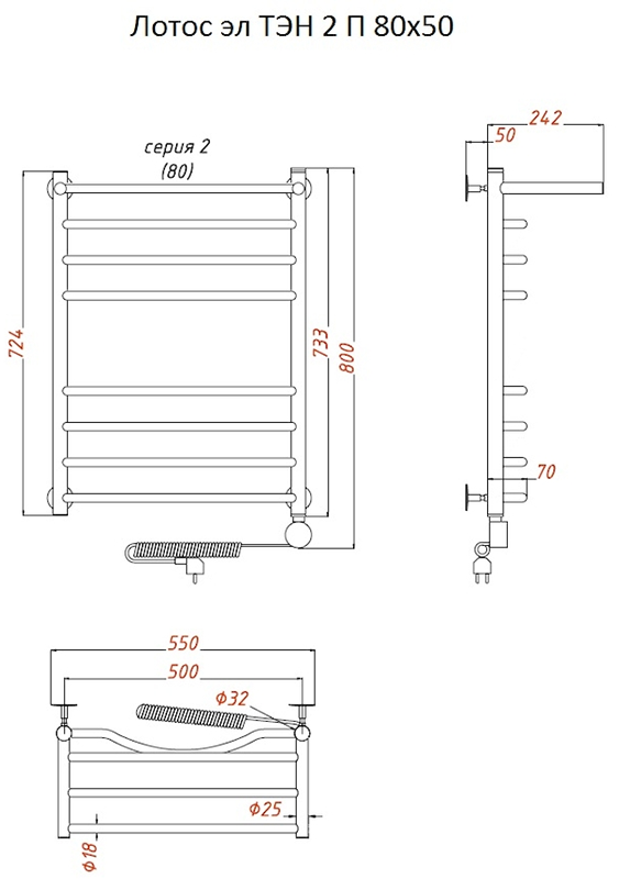 Внимание! Для скрытого монтажа электропроводки необходимо приобрести комплект скрытого подключения.Полотенцесушитель электрический комплектуется ТЭНом с терморегулятором и таймером.Изделие производится из нержавеющей стали AISI 201. Вертикальные трубы d -32 мм., для горизонтальных вставок используется труба d — 18 мм.Нагревательным элементом в полотенцесушителе является ТЭН. Полотенцесушитель заполнен бытовым антифризомЭкономичность: ТЭН нагревает антифриз до нужной температуры и выключается, далее при остывании полотенцесушителя он включается опять. Таким образом он работает не постоянно и получается, что ТЭН потребляет электричество не 300 Вт, а порядка 100 — 150 ВтМощность электрического прибора порядка 100 Вт при стоимости 1 Вт — 5 руб несложно посчитать: 100Вт х 24 = 2,4 кВт в сутки. Стоимость эксплуатации изделия за сутки 2,4 кВт х 5 руб. = 12 руб. При максимальной температуре расход электричества за 30 дней составит порядка 360 руб. При условии если сушка работает круглосуточно на максимальной температуре.Удобство монтажа: Полотенцесушитель крепится к стене на четыре держателя. Изначально ТЭН не установлен в полотенцесушитель для безопасной транспортировки, его можно установить, как справа, так и слева предварительно перевернув полотенцесушитель вверх ногами и выкрутив заглушку с нужной стороны на место в которое установится ТЭН.Примечание. Внимательно изучите инструкцию по установке ТЭНа!Скрытое подключение: Для скрытого монтажа электропроводки необходимо приобрести комплект скрытого подключения.Подключение в розетку: В комплекте с ТЭНом имеется шнур с вилкой, который будет необходим при подключении к розетке.