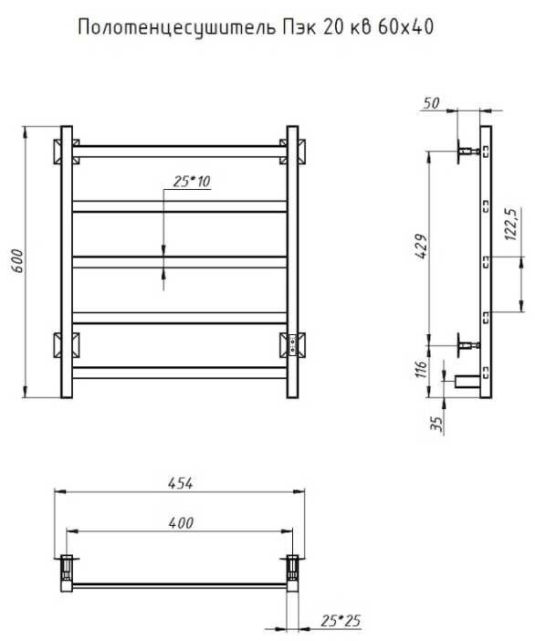 Внимание! Для скрытого монтажа электропроводки необходимо приобрести комплект скрытого подключения. Полотенцесушитель электрический комплектуется ТЭНом с терморегулятором и таймером. Изделие производится из нержавеющей стали AISI 201. Вертикальные трубы d -32 мм., для горизонтальных вставок используется труба d — 18 мм. Нагревательным элементом в полотенцесушителе является ТЭН. Полотенцесушитель заполнен бытовым антифризом.Экономичность: ТЭН нагревает антифриз до нужной температуры и выключается, далее при остывании полотенцесушителя он включается опять. Таким образом он работает не постоянно, и получается, что ТЭН потребляет электричество не 300 Вт, а порядка 100 — 150 Вт.Мощность электрического прибора порядка 100 Вт при стоимости 1 Вт — 5 руб несложно посчитать: 100Вт х 24 = 2,4 кВт в сутки. Стоимость эксплуатации изделия за сутки 2,4 кВт х 5 руб. = 12 руб. При максимальной температуре расход электричества за 30 дней составит порядка 360 руб. При условии если сушка работает круглосуточно на максимальной температуре.Удобство монтажа: Полотенцесушитель крепится к стене на четыре держателя. Изначально ТЭН не установлен в полотенцесушитель для безопасной транспортировки, его можно установить, как справа, так и слева предварительно перевернув полотенцесушитель вверх ногами и выкрутив заглушку с нужной стороны на место в которое установится ТЭН.Примечание. Внимательно изучите инструкцию по установке ТЭНа!Скрытое подключение: Для скрытого монтажа электропроводки необходимо приобрести комплект скрытого подключения.Подключение в розетку: В комплекте с ТЭНом имеется шнур с вилкой, который будет необходим при подключении к розетке.