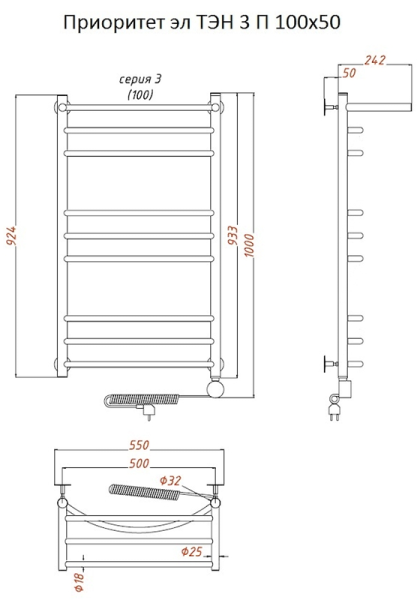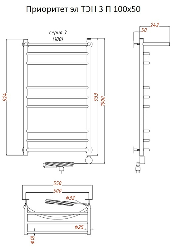 Внимание! Для скрытого монтажа электропроводки необходимо приобрести комплект скрытого подключения.Полотенцесушитель электрический комплектуется ТЭНом с терморегулятором и таймером.Изделие производится из нержавеющей стали AISI 201. Вертикальные трубы d -32 мм., для горизонтальных вставок используется труба d — 18 мм.Нагревательным элементом в полотенцесушителе является ТЭН. Полотенцесушитель заполнен бытовым антифризомЭкономичность: ТЭН нагревает антифриз до нужной температуры и выключается, далее при остывании полотенцесушителя он включается опять. Таким образом он работает не постоянно и получается, что ТЭН потребляет электричество не 300 Вт, а порядка 100 — 150 ВтМощность электрического прибора порядка 100 Вт при стоимости 1 Вт — 5 руб несложно посчитать: 100Вт х 24 = 2,4 кВт в сутки. Стоимость эксплуатации изделия за сутки 2,4 кВт х 5 руб. = 12 руб. При максимальной температуре расход электричества за 30 дней составит порядка 360 руб. При условии если сушка работает круглосуточно на максимальной температуре.Удобство монтажа: Полотенцесушитель крепится к стене на четыре держателя. Изначально ТЭН не установлен в полотенцесушитель для безопасной транспортировки, его можно установить, как справа, так и слева предварительно перевернув полотенцесушитель вверх ногами и выкрутив заглушку с нужной стороны на место в которое установится ТЭН.Примечание. Внимательно изучите инструкцию по установке ТЭНа!Скрытое подключение: Для скрытого монтажа электропроводки необходимо приобрести комплект скрытого подключения.Подключение в розетку: В комплекте с ТЭНом имеется шнур с вилкой, который будет необходим при подключении к розетке.