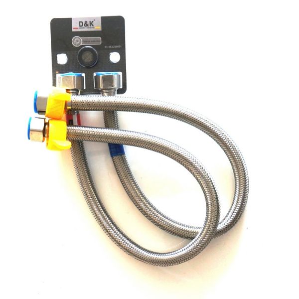 Гибкая подводка DQ гайка 1/2-гайка 1/2, 50 см DC1250051 Гарантия 5лет. На каждой подводке есть пластиковый ключ для легкого монтажа Размеры: Наружный диаметр шланга: 14,5мм Длина: 50см. Максимальное рабочее давление: 20 Бар Максимальная рабочая температура: 120гр. Комплектующие: Внутренний шланг - EPDM (нетоксичный каучук) - Оплетка из нержавеющей стали AISI-304 Плетение из 7 (семи) нитей. - Гайки, пресс-гильзы - из нержавеющей стали AISI-304 - Нипель - из латуни класса "А" В комплекте прокладки с металической сеткой, являются фильтром жесткой очистки. Устанавливаются в гайки фиксирующие подводку к трубам.