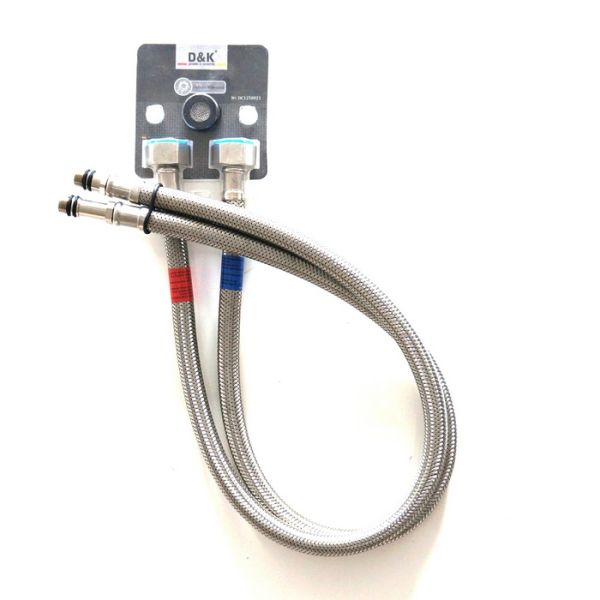 Гибкая подводка DQ гайка 1/2-штуцер М10, 60 см DC1250021 - для смесителя Гарантия 5лет. Размеры: Наружный диаметр шланга: 12,5мм Длина: 60см. Максимальное рабочее давление: 20 Бар Максимальная рабочая температура: 120гр. Комплектующие: Внутренний шланг - EPDM (нетоксичный каучук) - Оплетка из нержавеющей стали AISI-304 Плетение из 7 (семи) нитей. - Гайки, штуцер, пресс-гильза - из нержавеющей стали AISI-304 - Нипель - из латуни класса "А" - Штуцеры разной длины, для удобства монтажа в смеситель. В комплекте прокладки с металической сеткой, являются фильтром жесткой очистки. Устанавливаются в гайки фиксирующие подводку к трубам.