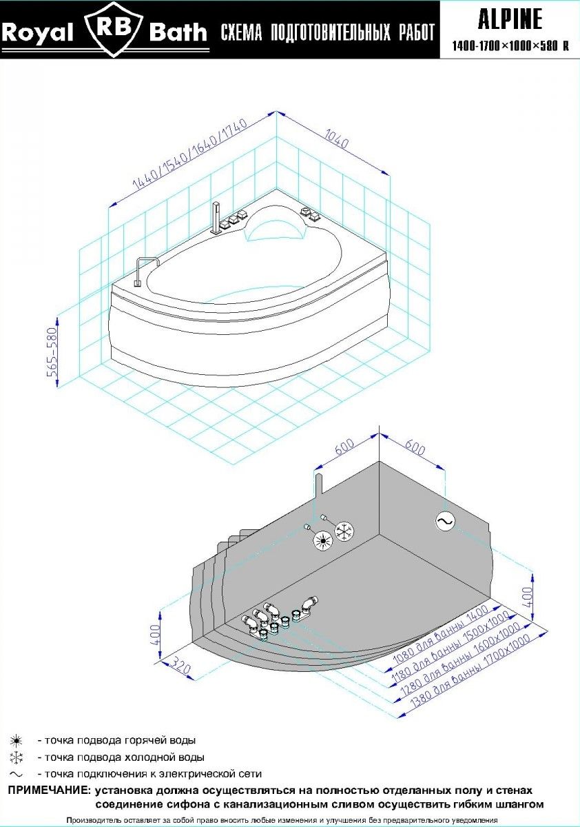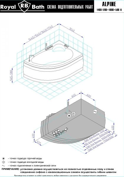 Акриловая ванна Royal Bath - идеальный выбор для создания атмосферы релакса и умиротворения, как в просторной в ванной комнате, так и в комнатном санузле. Основным преимуществом ванны из акрила считается её малый вес, высокая гигиеничность данного материала и низкая теплопроводность, долго сохраняющая комфортную температуру воды.Форма ванны Royal Bath замечательно подойдет к любому интерьерному решению, в различных вариантах размещения внутри ванной комнаты. Пристенная установка - это наиболее традиционный вид установки, а при использовании декоративного экрана пространство под ванной можно использовать как место хранения моющих средств. Оптимальная глубина позволяет принимать ванну с максимальным комфортом и полным расслаблением. Ванна Royal Bath выполнена со строгим соблюдением всех значительных элементов современного стиля.Благодаря тому, что родина бренда Royal Bath - Россия, можно смело быть уверенным в непревзойденном качестве и долговечности ванны, так как производство полностью соответствует стандартам качества. Акриловая ванна Royal Bath - это незаменимый, основной элемент любой ванной комнаты, без которого невозможно обойтись, ни в многоквартирном доме, ни в загородном коттедже.Комплектация гидромассажной ванны:- акриловая ванна Alpine 140x95x58;- каркас сварной к ванне Alpine 140;- панель к ванне Alpine 140;- гидромассажная система на 6 форсунок;- спинной массаж на 6 форсунок;- аэромассаж с хромотерапией 8 форсунок;- слив-перелив для ванны полуавтомат 60 см.Ожидаемый срок поставки 7 дней.Обратите внимание: данная позиция поставляется под заказ! Товар поставляется по 100%-ной предоплате.Данный товар является заказным и имеет индивидуально-определенные свойства.