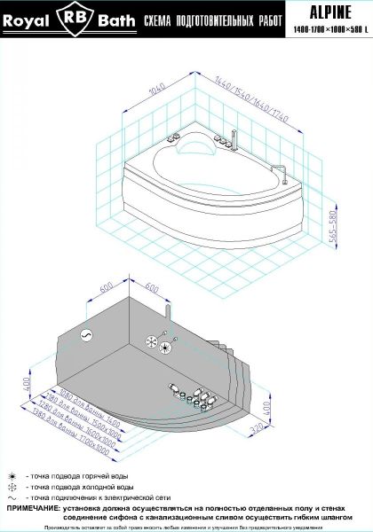 Акриловая ванна Royal Bath - идеальный выбор для создания атмосферы релакса и умиротворения, как в просторной в ванной комнате, так и в комнатном санузле. Основным преимуществом ванны из акрила считается её малый вес, высокая гигиеничность данного материала и низкая теплопроводность, долго сохраняющая комфортную температуру воды.Форма ванны Royal Bath замечательно подойдет к любому интерьерному решению, в различных вариантах размещения внутри ванной комнаты. Пристенная установка - это наиболее традиционный вид установки, а при использовании декоративного экрана пространство под ванной можно использовать как место хранения моющих средств. Оптимальная глубина позволяет принимать ванну с максимальным комфортом и полным расслаблением. Ванна Royal Bath выполнена со строгим соблюдением всех значительных элементов современного стиля.Благодаря тому, что родина бренда Royal Bath - Россия, можно смело быть уверенным в непревзойденном качестве и долговечности ванны, так как производство полностью соответствует стандартам качества. Акриловая ванна Royal Bath - это незаменимый, основной элемент любой ванной комнаты, без которого невозможно обойтись, ни в многоквартирном доме, ни в загородном коттедже.Комплектация гидромассажной ванны:- акриловая ванна Alpine 170x100x58;- каркас сварной к ванне Alpine 170;- панель к ванне Alpine 170;- гидромассажная система на 6 форсунок;- слив-перелив для ванны полуавтомат 60 см.Ожидаемый срок поставки 7 дней.Обратите внимание: данная позиция поставляется под заказ! Товар поставляется по 100%-ной предоплате.Данный товар является заказным и имеет индивидуально-определенные свойства.