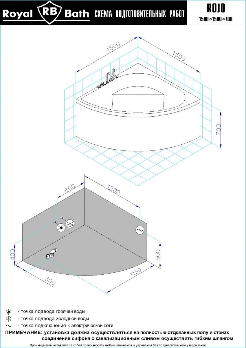 Акриловая ванна Royal Bath - идеальный выбор для создания атмосферы релакса и умиротворения, как в просторной в ванной комнате, так и в комнатном санузле. Основным преимуществом ванны из акрила считается её малый вес, высокая гигиеничность данного материала и низкая теплопроводность, долго сохраняющая комфортную температуру воды.Форма ванны Royal Bath замечательно подойдет к любому интерьерному решению, в различных вариантах размещения внутри ванной комнаты. Пристенная установка - это наиболее традиционный вид установки, а при использовании декоративного экрана пространство под ванной можно использовать как место хранения моющих средств. Оптимальная глубина позволяет принимать ванну с максимальным комфортом и полным расслаблением. Ванна Royal Bath выполнена со строгим соблюдением всех значительных элементов современного стиля.Благодаря тому, что родина бренда Royal Bath - Россия, можно смело быть уверенным в непревзойденном качестве и долговечности ванны, так как производство полностью соответствует стандартам качества. Акриловая ванна Royal Bath - это незаменимый, основной элемент любой ванной комнаты, без которого невозможно обойтись, ни в многоквартирном доме, ни в загородном коттедже.Комплектация гидромассажной ванны:- акриловая ванна Rojo 150x150x65;- каркас сварной к ванне Rojo 150;- панель фронтальная к ванне Rojo 150;- гидромассажная система на 4 форсунки;- спинной массаж на 6 форсунок;- аэромассаж с хромотерапией на 8 форсунок;- слив-перелив для ванны полуавтомат 60 см.Ожидаемый срок поставки 7 дней.Обратите внимание: данная позиция поставляется под заказ! Товар поставляется по 100%-ной предоплате.Данный товар является заказным и имеет индивидуально-определенные свойства.