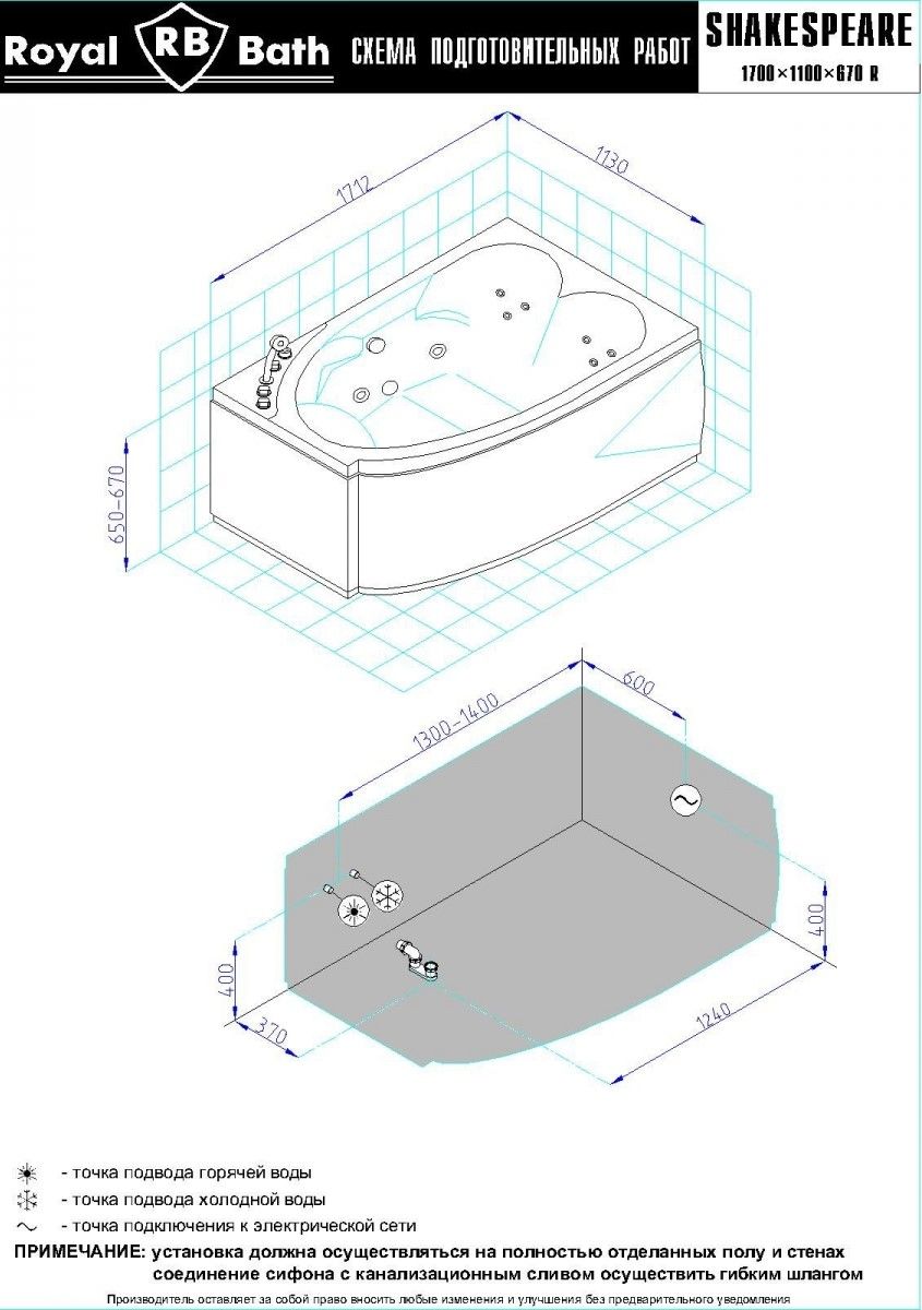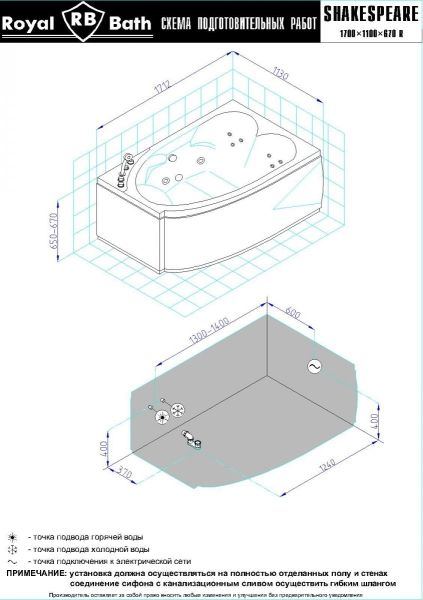 Акриловая ванна Royal Bath - идеальный выбор для создания атмосферы релакса и умиротворения, как в просторной в ванной комнате, так и в комнатном санузле. Основным преимуществом ванны из акрила считается её малый вес, высокая гигиеничность данного материала и низкая теплопроводность, долго сохраняющая комфортную температуру воды.Форма ванны Royal Bath замечательно подойдет к любому интерьерному решению, в различных вариантах размещения внутри ванной комнаты. Пристенная установка - это наиболее традиционный вид установки, а при использовании декоративного экрана пространство под ванной можно использовать как место хранения моющих средств. Оптимальная глубина позволяет принимать ванну с максимальным комфортом и полным расслаблением. Ванна Royal Bath выполнена со строгим соблюдением всех значительных элементов современного стиля.Благодаря тому, что родина бренда Royal Bath - Россия, можно смело быть уверенным в непревзойденном качестве и долговечности ванны, так как производство полностью соответствует стандартам качества. Акриловая ванна Royal Bath - это незаменимый, основной элемент любой ванной комнаты, без которого невозможно обойтись, ни в многоквартирном доме, ни в загородном коттедже.Комплектация гидромассажной ванны:- акриловая ванна Shakespeare 170x110x67 с каркасом;- панель фронтальная к ванне Shakespeare 170;- гидромассажная система на 6 форсунок;- спинной массаж на 4 форсунки;- смеситель на борт ванны RB Hardon 611;- слив-перелив для ванны полуавтомат 60 см.Ожидаемый срок поставки 7 дней.Обратите внимание: данная позиция поставляется под заказ! Товар поставляется по 100%-ной предоплате.Данный товар является заказным и имеет индивидуально-определенные свойства.