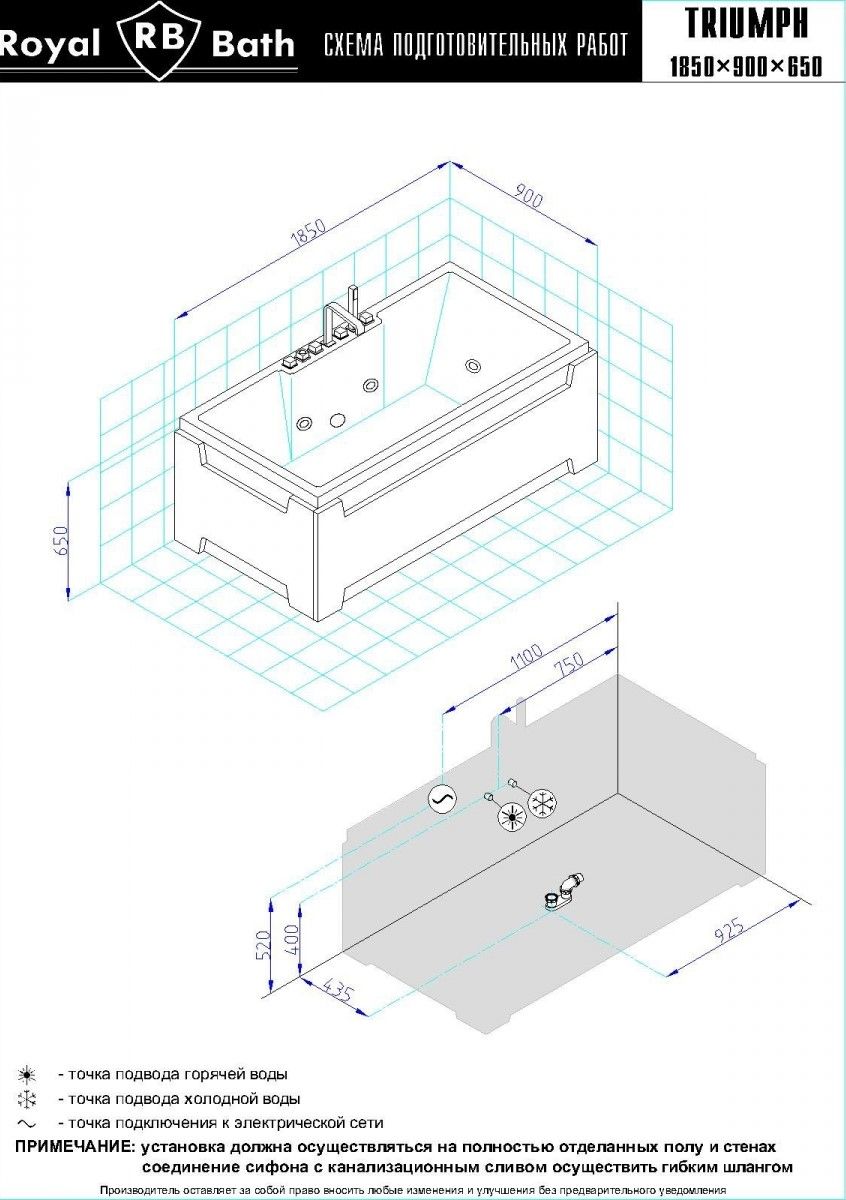 Акриловая ванна Royal Bath - идеальный выбор для создания атмосферы релакса и умиротворения, как в просторной в ванной комнате, так и в комнатном санузле. Основным преимуществом ванны из акрила считается её малый вес, высокая гигиеничность данного материала и низкая теплопроводность, долго сохраняющая комфортную температуру воды.Форма ванны Royal Bath замечательно подойдет к любому интерьерному решению, в различных вариантах размещения внутри ванной комнаты. Пристенная установка - это наиболее традиционный вид установки, а при использовании декоративного экрана пространство под ванной можно использовать как место хранения моющих средств. Оптимальная глубина позволяет принимать ванну с максимальным комфортом и полным расслаблением. Ванна Royal Bath выполнена со строгим соблюдением всех значительных элементов современного стиля.Благодаря тому, что родина бренда Royal Bath - Россия, можно смело быть уверенным в непревзойденном качестве и долговечности ванны, так как производство полностью соответствует стандартам качества. Акриловая ванна Royal Bath - это незаменимый, основной элемент любой ванной комнаты, без которого невозможно обойтись, ни в многоквартирном доме, ни в загородном коттедже.Комплектация гидромассажной ванны:- акриловая ванна Triumph 185х87х65 в сборе;- гидромассажная система на 6 форсунок;- cмеситель на борт ванны RB Triumph 501;- слив-перелив для ванны полуавтомат 60 см.Ожидаемый срок поставки 7 дней.Обратите внимание: данная позиция поставляется под заказ! Товар поставляется по 100%-ной предоплате.Данный товар является заказным и имеет индивидуально-определенные свойства.