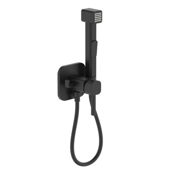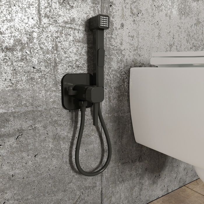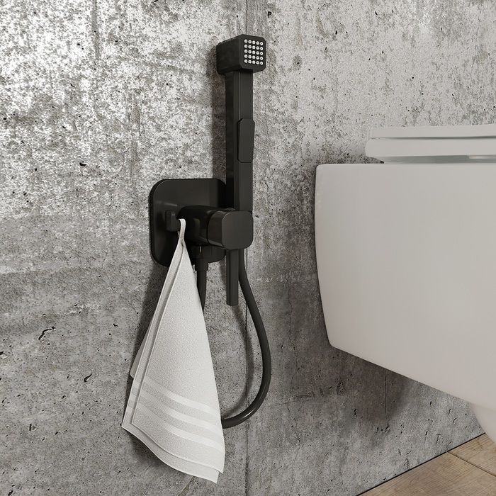 Встраиваемый смеситель с гигиеническим душем в стильном матовом черном цвете станет отличным дополнением современной ванной комнаты, привнесет в нее комфорт и эстетику. Имеет крючок для полотенца. Крючок и держатель для лейки при необходимости можно поменять местами. Гигиеническая лейка и гладкий душевой шланг длиной 1,2 метра в комплекте. Экономит пространство и упрощает уборку — благодаря скрытому монтажу в стену (на глубину 40-60 мм) и отсутствию больших выступающих элементов конструкции. Подключается с помощью любых труб, диаметр входных отверстий ½ дюйма.