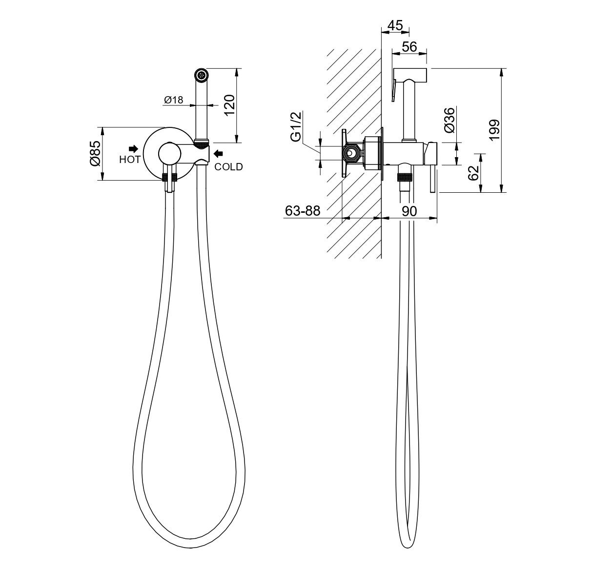• Душевой гарнитур: гигиеническая лейка, шланг, шланговое подсоединение с держателем