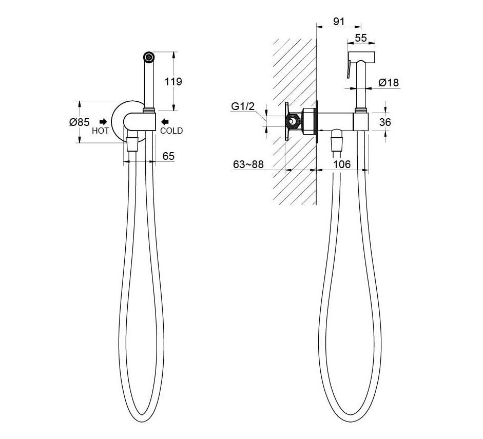 • Душевой гарнитур: гигиеническая лейка, шланг, шланговое подсоединение с держателем