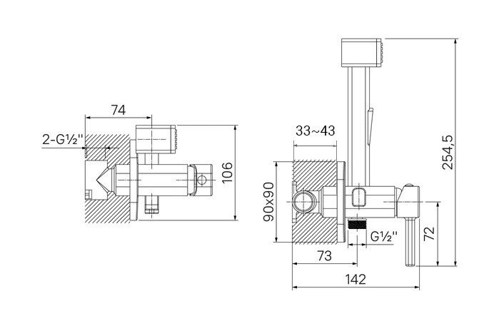 Смеситель экономит пространство и упрощает уборку — благодаря скрытому монтажу в стену (на глубину 33-43 мм) и отсутствию больших выступающих элементов конструкции. Подключается с помощью любых труб, диаметр входных отверстий ½ дюйма.