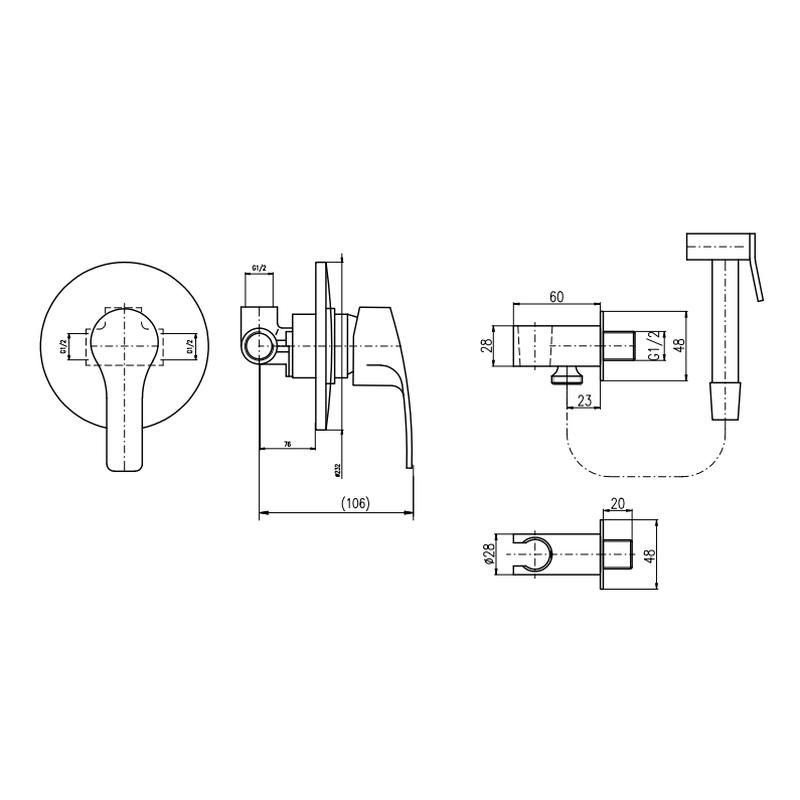 Комплектация: смеситель, лейка, шланговое подключение с держателем лейки, шланг, внутренняя часть