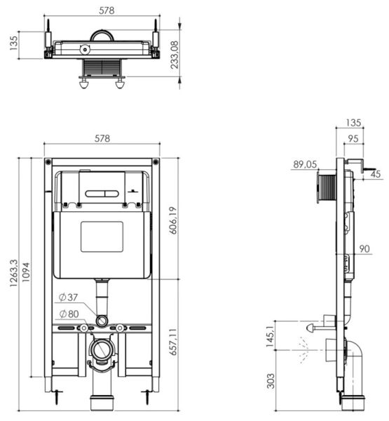 Смывной бачок с маленьким ревизионным окошкомМонтажная высота 1094 - 1263 ммДля монтажа перед стеной или стеной перегородкойСамонесущая стальная рама с порошковым напылениемПодготовлена для облицовкиФиксированные подключенияДля одиночного или рядного монтажаБыстрая регулировка по высотеКрепежный материал2 держателя для унитазаКрепление для керамикиРасстояние между болтами 180/230 ммВыходной патрубок для унитаза 80 ммРегулировка глубины монтажаВпускной и смывной гарнитурыСмывной бачок 9 лБесшовный бачок, бесшумный сливЗаводская настройка 6 л и 3 лПневматический смывной клапан с двумя режимами слива: 2-х объёмный, непрерывныйПодключение воды сверхуАрматурная группа IВ соответствии с DINС изоляцией от конденсационной влагиПодключение воды DN 15С принадлежностями для монтажа перед стенойС накладной прямоугольной панелью