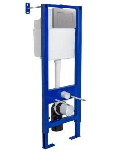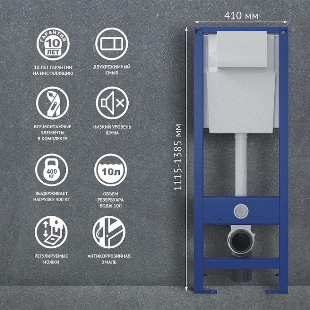 Узкая рама шириной 41 см.Металлический каркас, окрашенный антикоррозийной эмалью.Расчетная нагрузка 400кг. Объём резервуара воды 10 л с тепло- и шумоизоляцией.Подвод воды внутрь резервуара (G1/2 наружная).Объем смыва 3/6 литра с возможностью регулировки.Управление механическое, две кнопки.Межосевое расстояние под шпильки для подвеса унитаза 18 и 23 см. Полный комплект для установки включает в себяшумоизоляционную прокладку и лекало для монтажных отверстий.