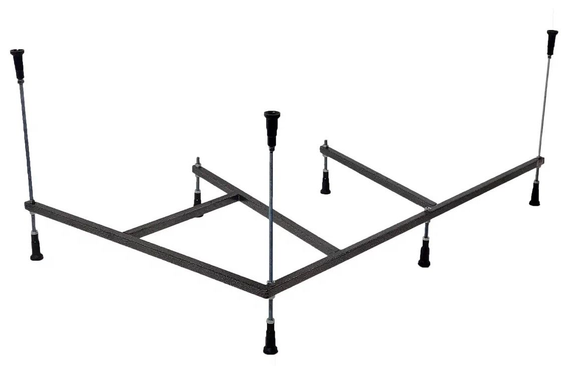 Усиленный цельносварной стальной каркас для ванны изготовлен из квадратного металлического профиля 2х2 см и окрашен темно-бронзовой молотковой краской. Каркас имеет 8 ножек и 4 опоры в борт ванны снизу. Предназначен для использования во влажных помещениях.
