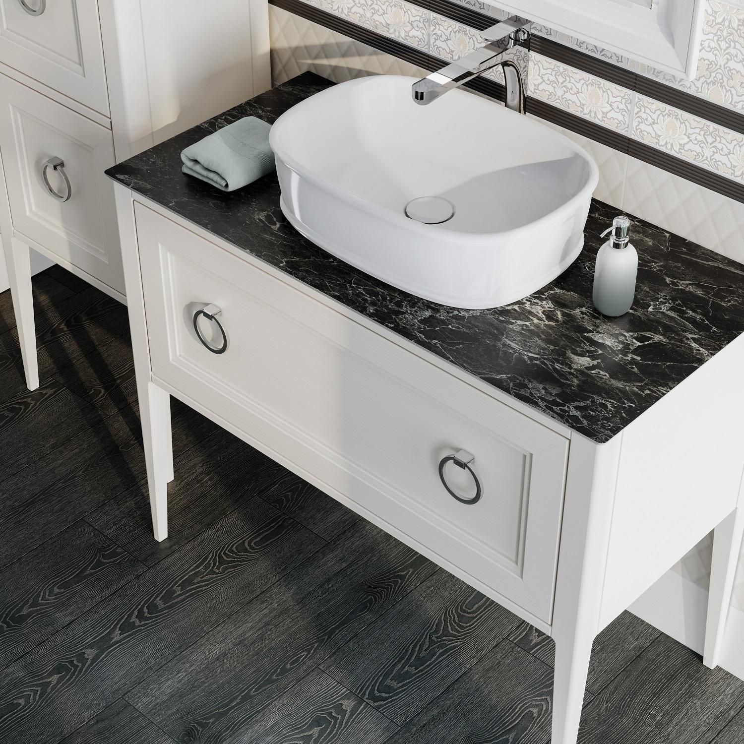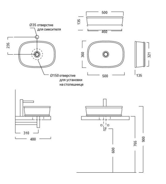 Белая глянцевая накладная раковина без отверстия под смеситель, ширина 50 см. Донный клапан в комплект не входит, рекомендованный донный клапан . Донный клапан конструктивно не закрывается полностью, так как у раковины отсутствует отверстие слив-перелив. Раковина устанавливается на столешницы, возможно использование со столешницами и тумбами