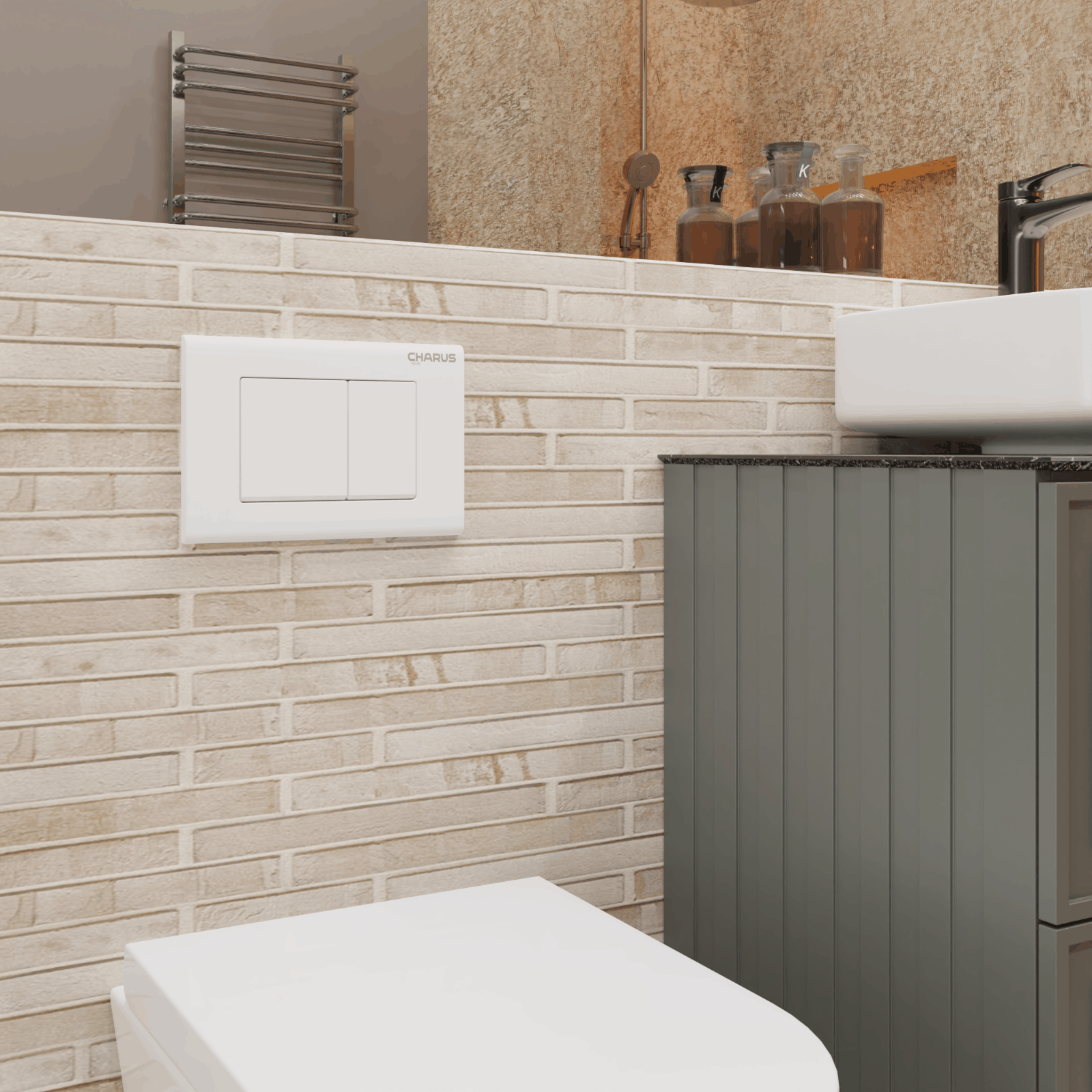 Клавиша для инсталляции CHARUS TMКомплектация: Панель в сборе, 2 крепежных пластиковых винта, 2 толкателя привода смыва, инструкция по установке