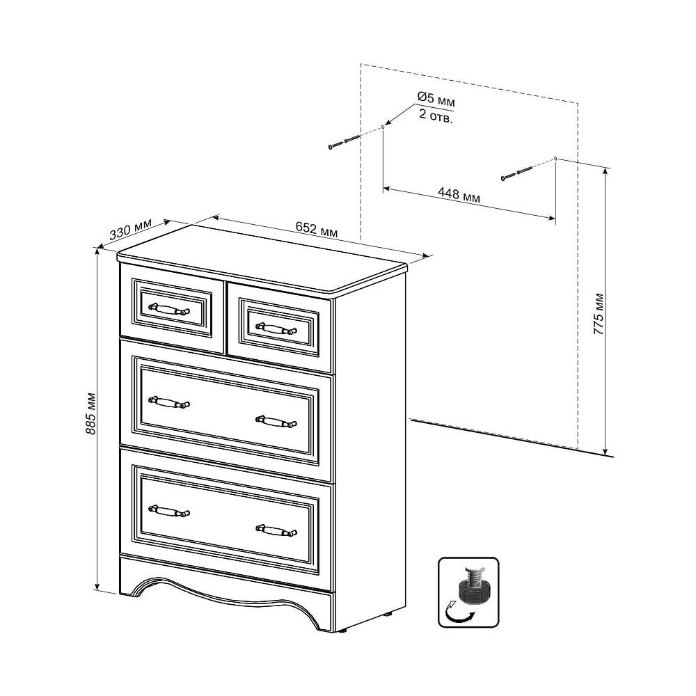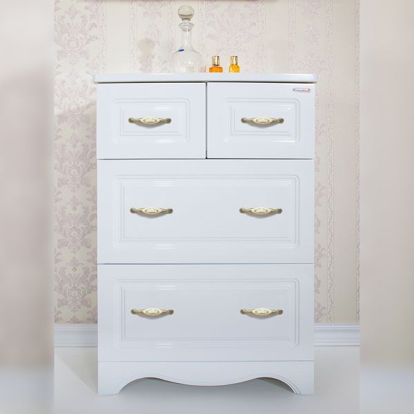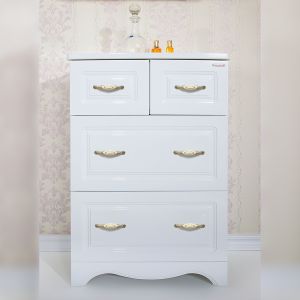 Предназначен для хранения полотенец, белья, халатов и прочих принадлежностей, необходимых в ванной комнате. Выполненная в классическом стиле модель обладает массой функциональных достоинств: во-первых, изделие оснащено четырьмя выдвижными ящиками разного размера. Во вторых, свободной остается поверхность комода. Также хочется отметить, что модель выполнена из качественного сырья, способного противостоять условиям влажной агрессивной среды, свойственной ванным комнатам. Изюминка комода «Анна 60» – это фарфоровые вставки на металлических ручках.