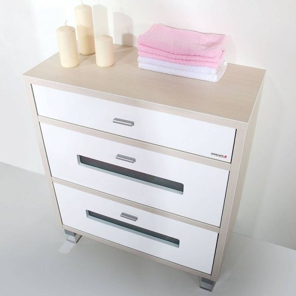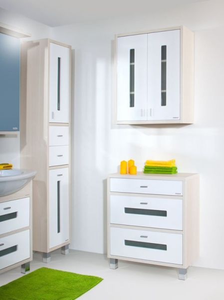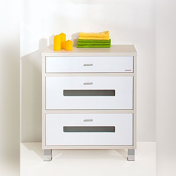 Удобный комод Бали 70 см предназначен для хранения полотенец, белья, халатов и прочих принадлежностей, необходимых в ванной комнате. Выполненная в современном стиле модель обладает массой функциональных достоинств: во-первых, изделие оснащено парой высоких выдвижных ящиков и одним – узким, кроме того, свободной остается поверхность комода; во-вторых, модель выполнена из качественного сырья, способного противостоять условиям влажной агрессивной среды, свойственной ванным комнатам. Изюминка комода «Бали 71 см» – цветовое решение (сочетание беленого дерева и белого глянца) и витражные вставки из матового стекла, украшающие передние панели выдвижных ящиков.