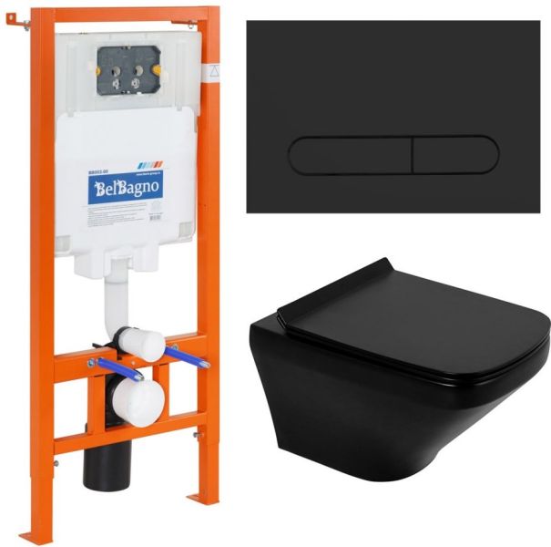 Комплект 4 в 1 BelBagno BB3201CHR-MB/BB3201SC-MB/BB002-80/BB007-PR-NERO.M унитаз подвесной SELA BB3201CHR-MB с сиденьем BB3201SC-MB система инсталляции для унитазов BB002-80 с кнопкой смыва BB007-PR-NERO.M купить