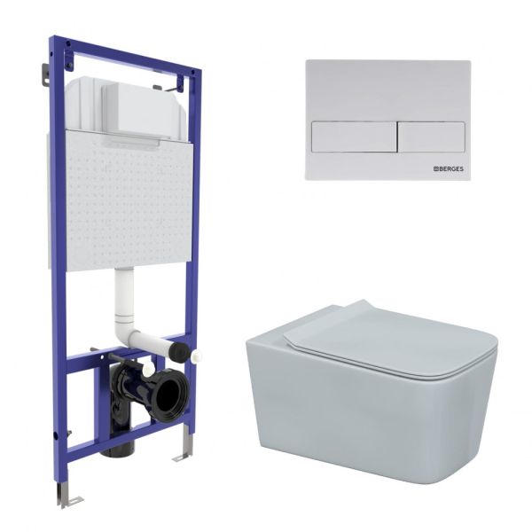 Полный комплект BERGES для монтажа подвесного унитаза. 1. Инсталляция NOVUM525Толщина бачка 80 мм.Межосевое расстояние под крепежные шпильки унитаза 18 и 23 см.Резервуар воды объемом 10 литров с тепло-шумоизоляцией.Уровень шума при давлении 3 бар не превышает 13 дБ.Подвод воды сверху (G1/2 наружная).Объем смыва 3/6 литра с возможностью регулировки. Металлический каркас, окрашенный антикоррозийной эмалью, расчетная нагрузка до 400 кг.Ножки регулировки высоты из оцинкованной стали. Возможность установки в угол. 2. кнопка L4 Soft Touch белаяABS-пластик 3. унитаз FLOE Rimless,безободковая система смыва, антибактериальное покрытиеэкономия воды, скрытый крепеж 4. сиденье дюропласт Floe Slim SOмикролифт, быстросъем. Все крепежи для установки в комплекте