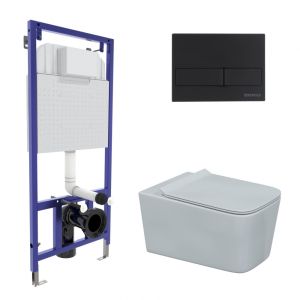 Полный комплект BERGES для монтажа подвесного унитаза. 1. Инсталляция NOVUM525Толщина бачка 80 мм.Межосевое расстояние под крепежные шпильки унитаза 18 и 23 см.Резервуар воды объемом 10 литров с тепло-шумоизоляцией.Уровень шума при давлении 3 бар не превышает 13 дБ.Подвод воды сверху (G1/2 наружная).Объем смыва 3/6 литра с возможностью регулировки. Металлический каркас, окрашенный антикоррозийной эмалью, расчетная нагрузка до 400 кг.Ножки регулировки высоты из оцинкованной стали. Возможность установки в угол. 2. кнопка L5 Soft Touch чернаяABS-пластик 3. унитаз FLOE Rimless,безободковая система смыва, антибактериальное покрытиеэкономия воды, скрытый крепеж 4. сиденье дюропласт Floe Slim SOмикролифт, быстросъем. Все крепежи для установки в комплекте
