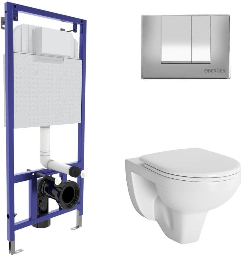Полный комплект BERGES для монтажа подвесного унитаза. 1. Инсталляция NOVUM525Толщина бачка 80 мм.Межосевое расстояние под крепежные шпильки унитаза 18 и 23 см.Резервуар воды объемом 10 литров с тепло-шумоизоляцией.Уровень шума при давлении 3 бар не превышает 13 дБ.Подвод воды сверху (G1/2 наружная).Объем смыва 3/6 литра с возможностью регулировки. Металлический каркас, окрашенный антикоррозийной эмалью, расчетная нагрузка до 400 кг.Ножки регулировки высоты из оцинкованной стали. Возможность установки в угол. 2. кнопка S3хром глянец 3. унитаз GAMMAкаскадный смыв, открытый ободокантибактериальное покрытиеэкономия воды 4. сиденье дюропласт Gammaмикролифт, быстросъем Все крепежи для установки в комплекте