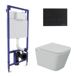 Полный комплект BERGES для монтажа подвесного унитаза. 1. Инсталляция NOVUM525Толщина бачка 80 мм.Межосевое расстояние под крепежные шпильки унитаза 18 и 23 см.Резервуар воды объемом 10 литров с тепло-шумоизоляцией.Уровень шума при давлении 3 бар не превышает 13 дБ.Подвод воды сверху (G1/2 наружная).Объем смыва 3/6 литра с возможностью регулировки. Металлический каркас, окрашенный антикоррозийной эмалью, расчетная нагрузка до 400 кг.Ножки регулировки высоты из оцинкованной стали. Возможность установки в угол. 2. кнопка L5 черная Soft TouchABS-пластик 3. унитаз , FLOE S Rimlessбезободковая система смыва, антибактериальное покрытиеэкономия воды, скрытый крепеж 4. сиденье дюропласт Floe S Slim SOмикролифт, быстросъем Все крепежи для установки в комплекте