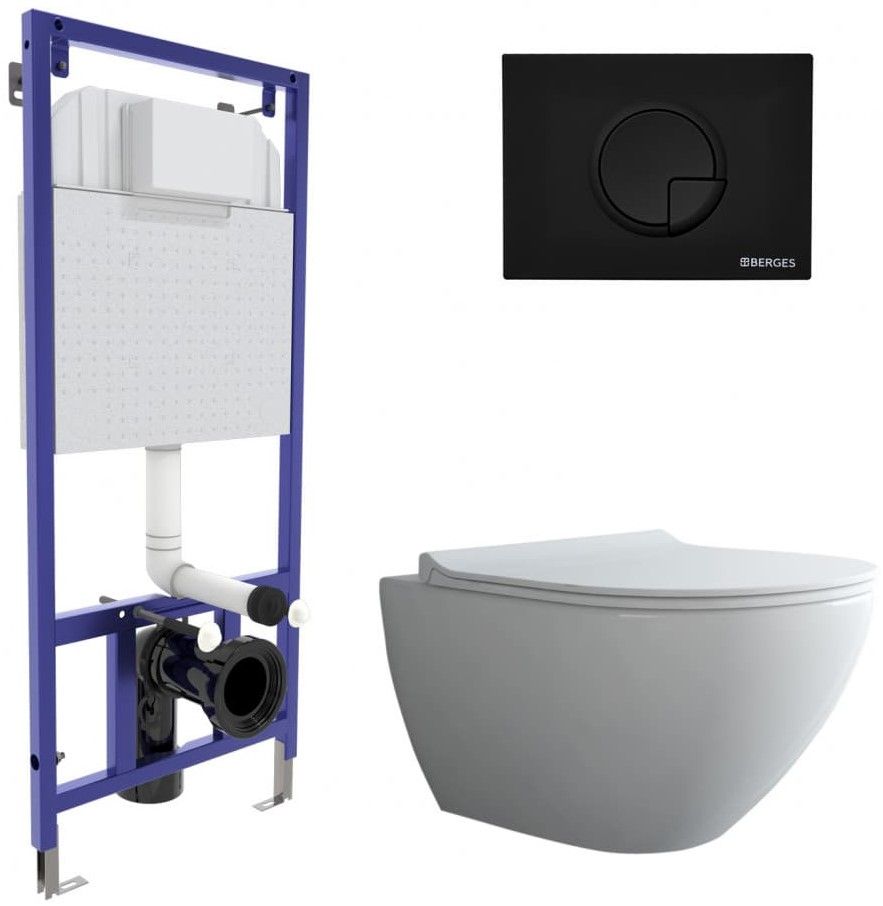 Полный комплект BERGES для монтажа подвесного унитаза. 1. Инсталляция NOVUM525Толщина бачка 80 мм.Межосевое расстояние под крепежные шпильки унитаза 18 и 23 см.Резервуар воды объемом 10 литров с тепло-шумоизоляцией.Уровень шума при давлении 3 бар не превышает 13 дБ.Подвод воды сверху (G1/2 наружная).Объем смыва 3/6 литра с возможностью регулировки. Металлический каркас, окрашенный антикоррозийной эмалью, расчетная нагрузка до 400 кг.Ножки регулировки высоты из оцинкованной стали. Возможность установки в угол. 2. кнопка R5 черная Soft TouchABS-пластик 3. унитаз PUMA Rimless 51см,безободковая система смыва, антибактериальное покрытиеэкономия воды, скрытый крепеж 4. сиденье дюропласт Toma Slim SOмикролифт, быстросъем. Все крепежи для установки в комплекте