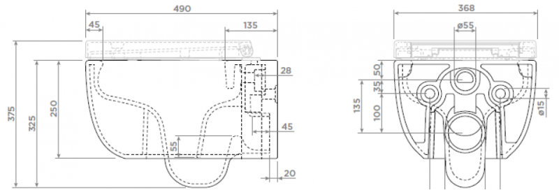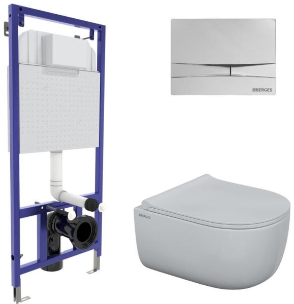 Полный комплект BERGES для монтажа подвесного унитаза. 1. Инсталляция NOVUM525Толщина бачка 80 мм.Межосевое расстояние под крепежные шпильки унитаза 18 и 23 см.Резервуар воды объемом 10 литров с тепло-шумоизоляцией.Уровень шума при давлении 3 бар не превышает 13 дБ.Подвод воды сверху (G1/2 наружная).Объем смыва 3/6 литра с возможностью регулировки. Металлический каркас, окрашенный антикоррозийной эмалью, расчетная нагрузка до 400 кг.Ножки регулировки высоты из оцинкованной стали. Возможность установки в угол. 2. кнопка F3 хром глянецABS-пластик 3. унитаз EGO Rimless,безободковая система смыва, антибактериальное покрытиеэкономия воды, скрытый крепеж 4. сиденье дюропласт Toma Slim SOмикролифт, быстросъем. Все крепежи для установки в комплекте