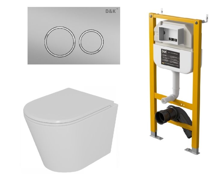 Комплект Унитаз подвесной безободковый (торнадо) DQ Venice DT1026516, 515*355*365мм, сиденье микролифт, белый+Инсталляция рамная скрытого монтажа DQ DI8050127, 500*117*1270мм, для подвесного унитаза, универсальная+Клавиша смыва DQ Bayern DB1529002, матовый хром