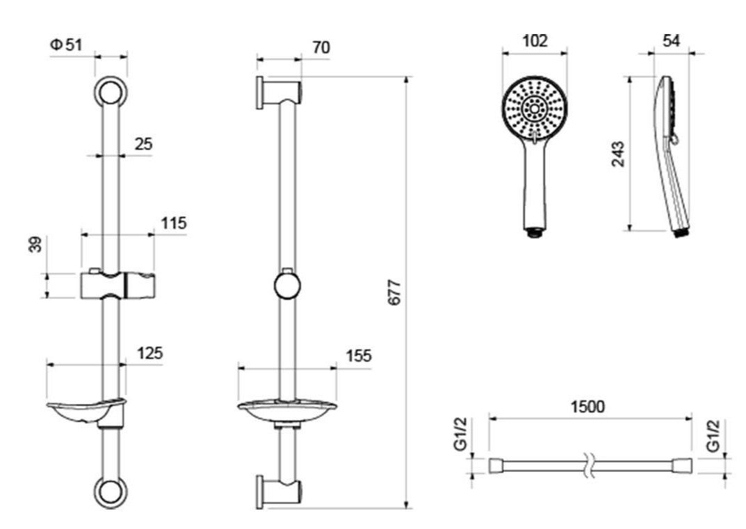 • Душевой гарнитур: душевая стойка с мыльницей, лейка, шланг