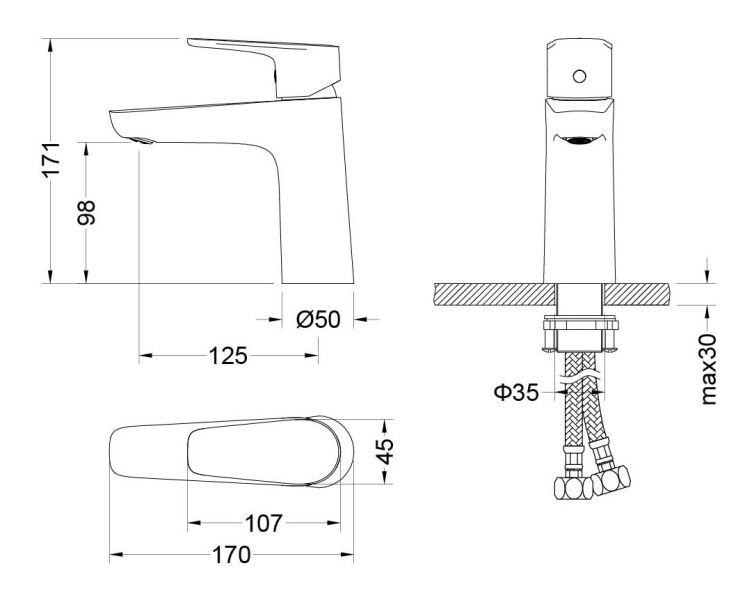 В комплекте: смеситель; гибкая подводка 60см; монтажный комплект