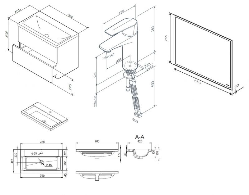 Комплект мебели для ванной AM.PM Gem 75 BK90GA.Характеристики:Подвесная тумба под раковину с двумя выдвижными ящиками.