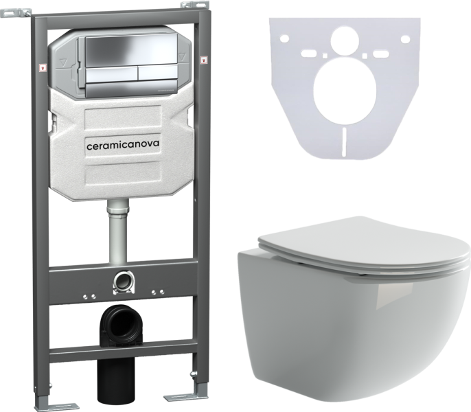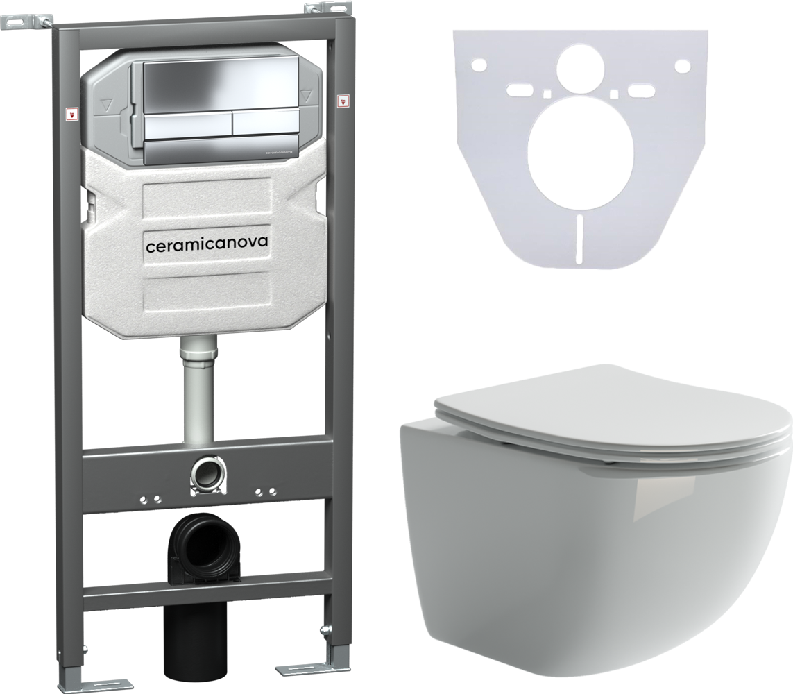 Сет 4 в 1: CN3009_1002CH_1000Подвесной унитаз Forma Rimless арт. CN3009Шумоизоляционная панель для инсталляции арт. CN1000Система инсталляции для унитазов CERAMICANOVA Envision с кнопкой смыва Flat цвет хром, креплениями, арт. CN1002CH Подвесной унитаз Ceramica Nova Forma Rimless CN3009 безободковый, с сиденьем Soft Close