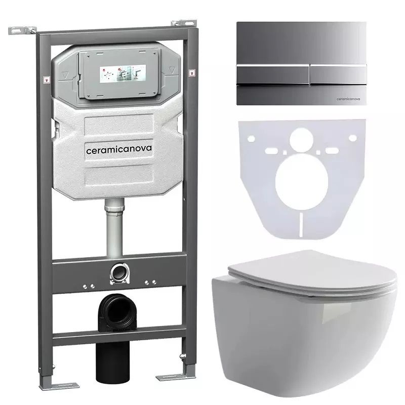 Сет 4 в 1: CN3009_1002M_1000Подвесной унитаз Forma Rimless арт. CN3009Шумоизоляционная панель для инсталляции арт. CN1000Система инсталляции для унитазов CERAMICANOVA Envision с кнопкой смыва Flat цвет хром матовый, креплениями, арт. CN1002M Подвесной унитаз Forma Rimless CN3009, глубокий смыв, с крепежом для полностью скрытого монтажа, ультра тонким с сидением и крышкой с функцией плавного закрытия, дюропласт.Шумоизоляционная панель для инсталляции CN1000