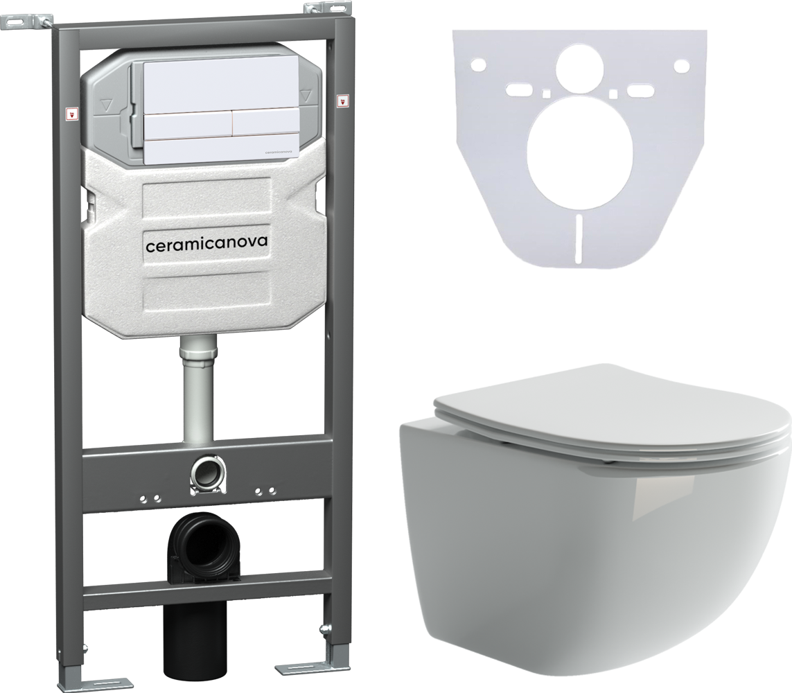 Сет 4 в 1: CN3009_1002W_1000Подвесной унитаз Forma Rimless арт. CN3009Шумоизоляционная панель для инсталляции арт. CN1000Система инсталляции для унитазов CERAMICANOVA Envision с кнопкой смыва Flat цвет белый, креплениями, арт. CN1002W Подвесной унитаз Ceramica Nova Forma Rimless CN3009 безободковый, с сиденьем Soft Close