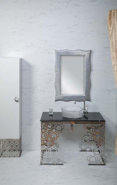 Консоль с раковиной Aura шириной 110 см цветом хромКонсоли произведены из нержавеющей стали благодаря чему стойки к коррозии. Гальваническое покрытие исполнено в цветах хром и золото. Можно выбрать столешницу из мрамора, хрустального каленого стекла в различных цветовых исполнениях, и Solid Glass (передовой материал, в состав которого входит мраморная крошка и стекло). Раковины-чаши выполнены из Corian, которыми можно дополнть консоли, хрустального стекла, керамики. Хорошим дополнением к консолям являются пеналы ArmadiArt, а также сифоны, клик-клаки и смесители Boheme.Мебель можно дополнить пеналом и зеркалом