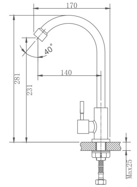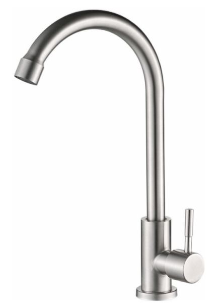 Кран на одну воду бренда Haiba.Изготовлен из нержавеющей стали.Картридж 35 мм.Укомплектован аэратором.Гибкая подводка 40 см.С поворотным изливом.