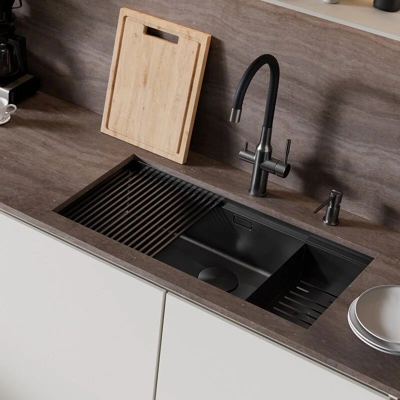Устойчивость к коррозии. Нержавеющая сталь SUS 304 характеризуется наличием 18% хрома и 10% никеля, что гарантирует ей высочайшую устойчивость к коррозии. PVD-покрытие защищает мойку от воздействия влаги и агрессивных веществ, что особенно важно для кухонной мойки.