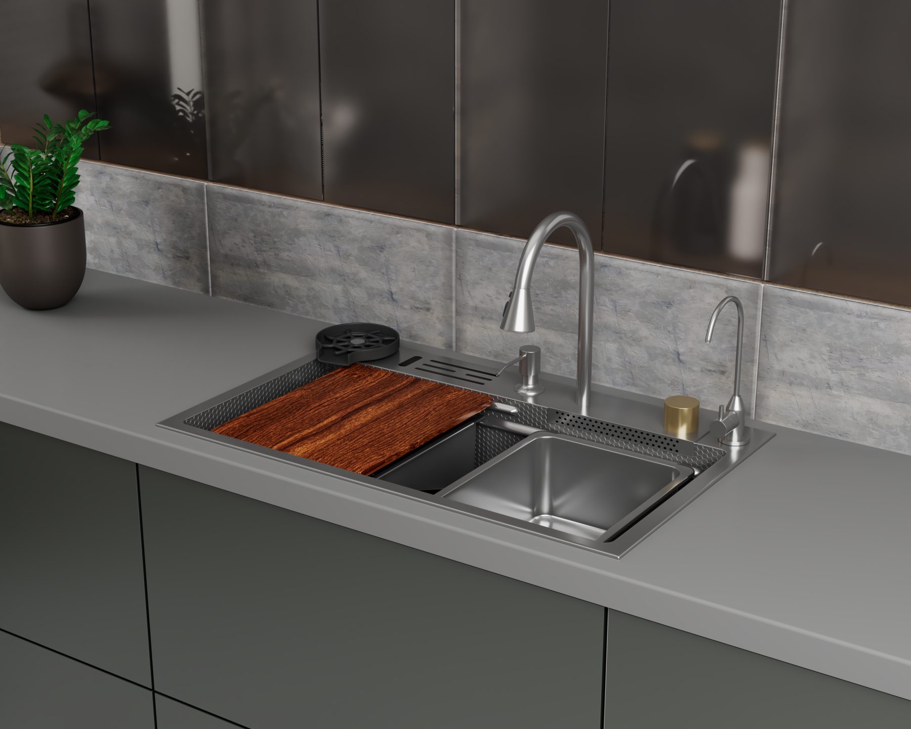 8) Разделочная доска для нарезки продуктов, 2 удобные корзины: одна для мытья и замачивания, вторая с функцией дуршлаг