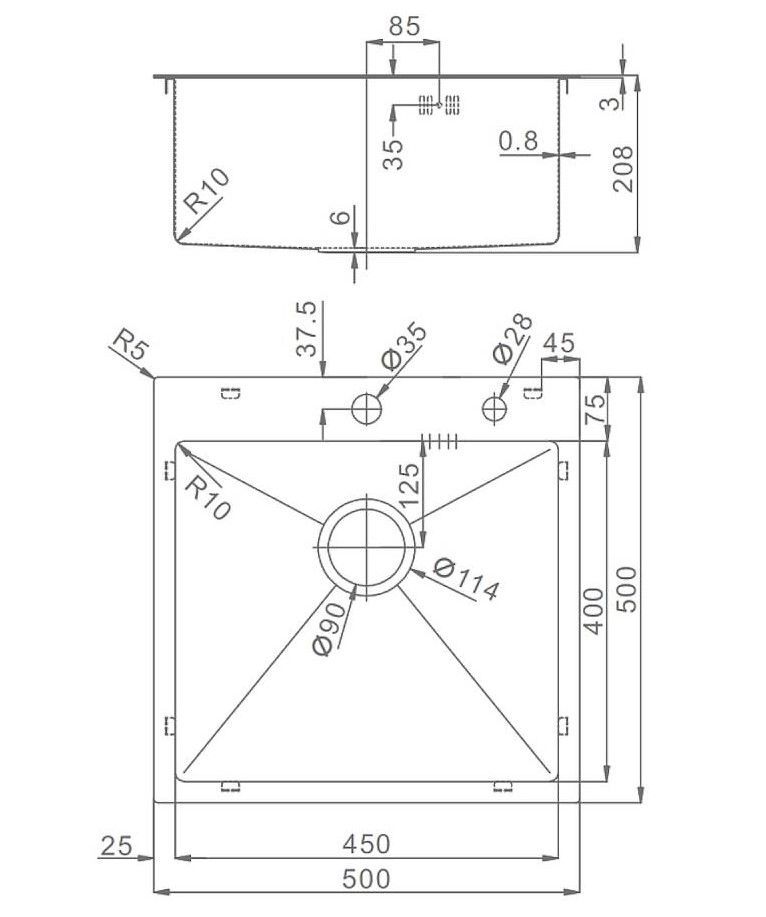 Толщина стали: верх - 3 мм / чаша - 0.8 мм, дополнительное отверстие для установки дозатора