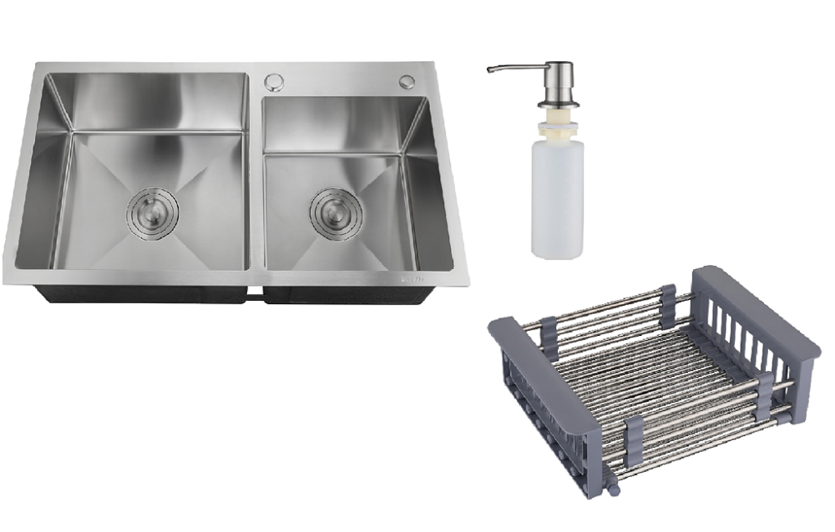 Набор 3 в 1 РМС (кухонная мойка+ корзина раздвижная+ дозатор врезной). В комплекте:евросифон высокого качества.Металлические элементы изготовленны из нержавеющей стали.Гофра с универсальным выходом 40/50. Цвет: нержавеющая сталь.Размер: 780*430 мм.Глубина: 200 мм.Толщина: 1-3 мм