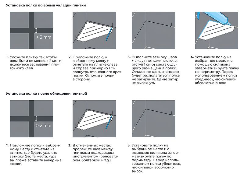 Металлическая полка RGW MT-02W 49279902-01 угловая БелаяПолка для душевой зоны RGW MT - современное решение для душевого пространства. Изготовлены из нержавеющей стали AISI 304, прочные, не ржавеют. Форма и размер полки, позволяет достичь максимальной стабильности конструкции и достаточной вместительности душевых принадлежностей, а легкая и быстрая установка в межплиточные швы без сверления плитки выгодно выделяет данное решение. Легкий монтаж без сверления плитки: Полки для душевой зоны, разработанные специально для монтажа после завершения ремонта, т. е. укладки плитки. Легко устанавливаются в любые угловые зоны в помещении, для этого прорезается шов между плитками, далее полочка вклеивается между плиткой на любой бытовой герметик. Полочки для душевой зоны RGW MT идеально подойдут для установки в душевое пространство, или в любую комнату, а так же найдут применение, на кухнях или в других помещениях.