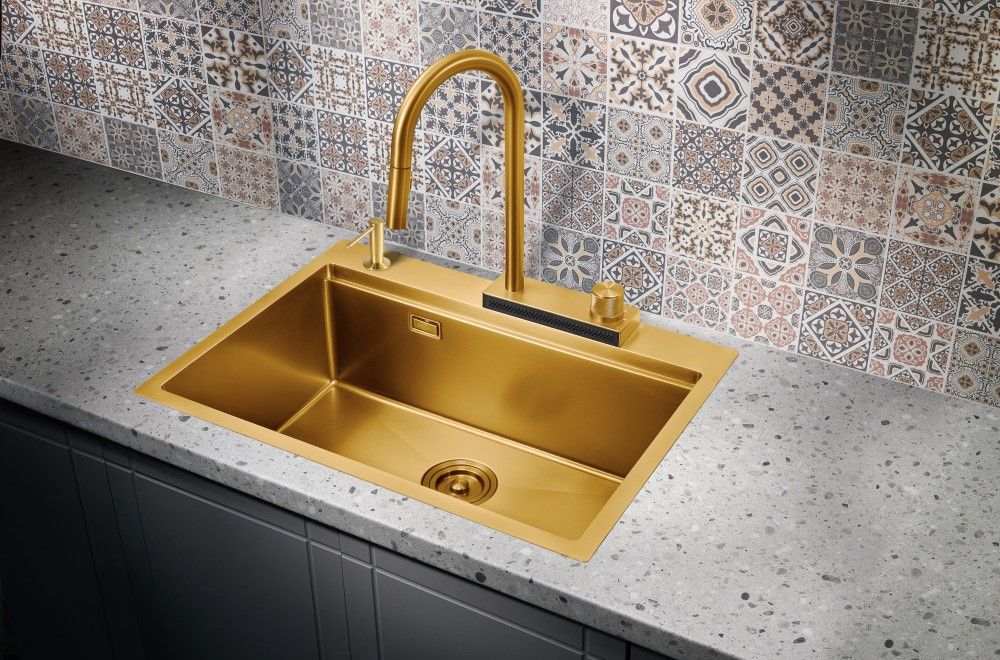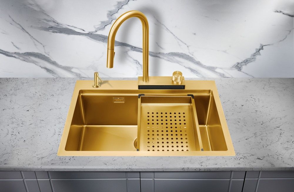 Мойка для кухни Milacio Denia 68 Steel MC.77418 в комплекте со смесителем и коландером брашированное золото купить