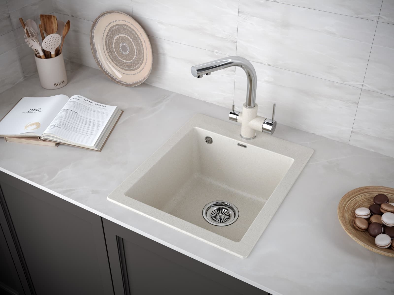 Материал мойки устойчив к механическим повреждениям, а также выдерживает температуру до 180 градусов.Однородная структура цвета